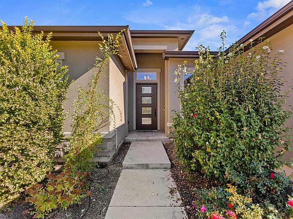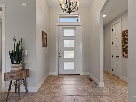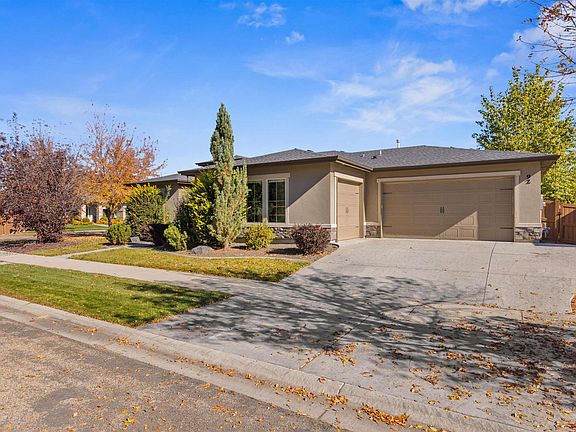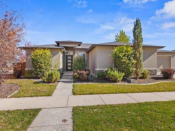 Welcome to this beautifully crafted 4-bedroom, 2-bath, single-level home in Eagle’s coveted River Walk community. Built in 2016 and offering approximately 1,930 sq ft of living space, this residence blends style, comfort, and modern efficiency. The floor plan features a split-bedroom design, ensuring privacy between the primary suite and secondary bedrooms. The heart of the home is the open great room with a cozy gas fireplace, flowing seamlessly into the bright kitchen, which includes granite countertops, a large island, double ovens, gas range, and Alder wood cabinetry. The primary suite features dual vanities, a walk-in shower, and generous closet space. The three additional bedrooms are perfect for guests, office, or flex space. Outside enjoy a covered patio, a yard with full vinyl fencing, drip irrigation, and corner lot appeal. The property includes a three-car attached garage, solar panels (owned), and access to neighborhood amenities such as the community pool, walking access to the Boise River Greenbelt, and close proximity to downtown Eagle dining and shopping. HOA is modest and keeps common spaces maintained. With modern finishes, energy savings, and an ideal location, this home offers both lifestyle and value.