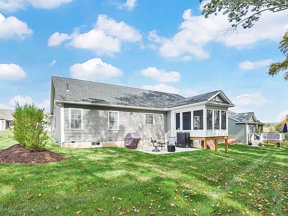 An absolute Stunner and the LOCATION abutting woodlands is the BEST! Enjoy the farmers front porch, center hall foyer w/ gorgeous hickory hardwood floors throughout. A wide open floor plan delivers a spacious living rm w/ a gas fireplace, perfect for those cozy nights opening to beautiful gray kitchen, 7 ft island, gas range, under cabinet lighting, tiled backsplash, wonderful pantry, quartz counters & lovely dining area opening to enclosed/screened porch & patio dining. The primary bedroom has two w/ in closets & a large ensuite w/ tiled shower boasting 3 shower heads functioning at the same time. Enter from the garage to a fantastic mudrm/laundry rm highlight built in cabinetry & pocket door. There are 2 other bedrooms, one currently used as an office w/ hdwd flrs. Enjoy the carefree lifestyle offered here and all those spring and summer days out on your porch and patio area. Custom blinds throughout, built in humidifier, on demand hot water loop system - instant hot water a bonus!