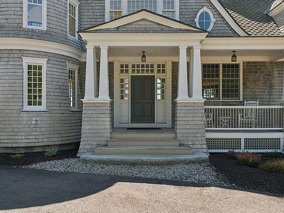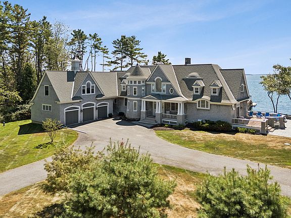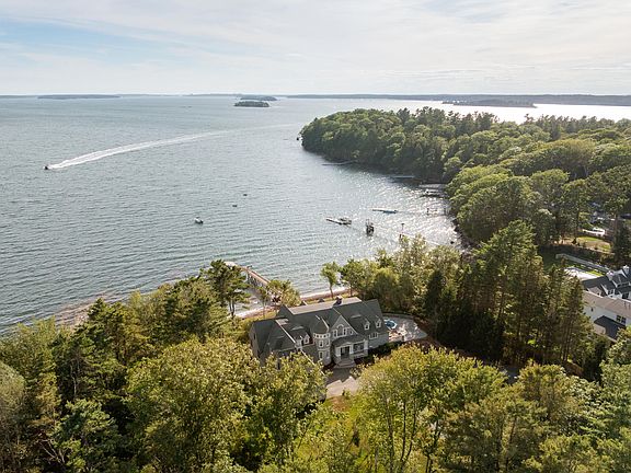 On the backshore of Cousins Island in Yarmouth, this remarkable property offers a rare chance to own a coveted deepwater stretch of Maine's coastline. Designed by Joe Waltman and expertly crafted by Anastos & Nadeau, this enchanting custom home captures sweeping ocean views from nearly every room, with each day framed by the rhythm of the tide. Southern exposure fills the home with natural light, with views stretching across the bay to the Portland skyline, and provides effortless access to open water for boating. Classic shingle-style architecture opens to soaring 10' and 25' ceilings and dramatic floor-to-ceiling windows, setting the stage for refined coastal living. Brazilian cherry and natural stone floors, elegant custom crown molding, built-ins, and an open balcony add richness and character. The family and living rooms flow seamlessly, inviting gatherings around the fireplace or evenings of effortless entertaining. The kitchen and dining area impress with a large center island, dual wall ovens, walk-in pantry, wet bar alcove, and a full suite of professional-grade appliances. A quiet den and first-floor office add versatility, with the office easily serving as a guest room. Upstairs, the home continues to inspire with even more breathtaking views and an elevated perch for watching the sea and stars. The primary suite offers a cozy reading nook with unobstructed water views, a coffered ceiling, walk-in closets, and a spa-like bath with marble, soaking tub, and walk-in shower. Three additional bedrooms, a hall bath, and a laundry room complete the upper level. A full daylight lower level provides flexible space for your needs. Outdoor living is equally compelling: a broad Ipe deck, sun-filled patio, and private path leading to a deepwater dock with boat mooring and sandy beach. Though this waterfront sanctuary feels worlds away, it remains just minutes from town, schools, shopping, and dining in some of Maine's very best coastal communities.