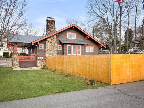 Unique California style craftsman Bungalow! This home will WOW you with all the charming details. The inviting oversized sitting porch is perfect for 3 seasons of the year. Enter into the open double living room separated by columns that features a beautiful fireplace with built-in shelving and a pellet stove that flows into a large dining room. The smartly laid out floor plan with hardwood flooring and 9' ceilings makes this home great for entertaining. 2 spacious bedrooms, 2nd floor bonus rooms, updated heating, electric, windows and metal roof. The exterior has quality Italian masonry details along with a newly fenced yard and oversized 1 1/2 car garage. GREAT BUY!