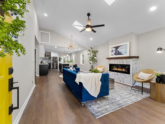 skylights, and a cozy electric fireplace. The stunning kitchen boasts quartz countertops, 36” custom soft-close cabinets, a walk-in pantry,