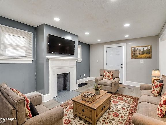 Step inside to a bright, open layout featuring new flooring, fresh paint, and recessed lighting throughout. The spacious living room is highlighted by a decorative fireplace and flows seamlessly into the dining area and stunning updated kitchen. The kitchen boasts granite countertops, white shaker cabinets, tile backsplash, and stainless steel appliances – perfect for entertaining or everyday cooking.