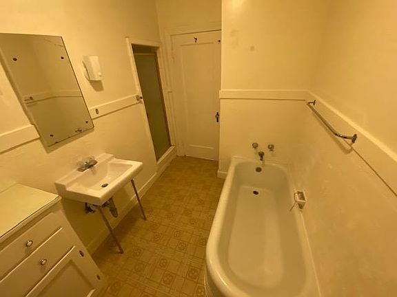 Adorable home with 2 large bedrooms and a basement. Home features central air, large kitchen with all appliances. (no warranty on fridge). Inside laundry with appliances included (no warranty). Living room and formal dining room feature original wood floors and wood trim. Large bathroom with plenty of built in storage and separate shower and tub. One bedroom can be painted prior to move in if buyer so desires (see photos). Basement that stays cool and has lighting, so there are some options as to what to use it for (storage, bedroom,?). As a bonus, water and trash is included in rent. Property shares with apartment above garage, but driveway and garage belong to home and both units have their own private yards. $1800 per month with a $1800 deposit. Only highly qualified tenants need apply.