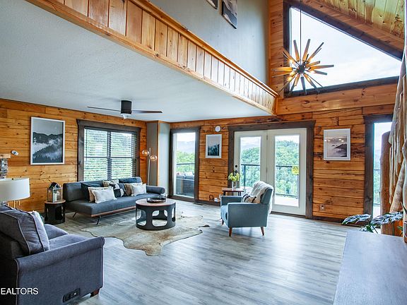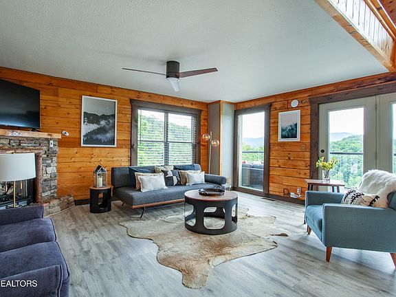 Commandingly sited within one of the top locations in the country for STR, this completely updated 3-bedroom cabin blends refined finishes with breathtaking mountain views. From its elevated setting, the horizon stretches over an endless mountain panorama, offering refreshing breezes and a peaceful unity with nature, making for an extraordinary backdrop for a getaway of refined mountain elegance. From the generous sunset view decks with hot tub and fire pit table, to the dramatic great room where a stone feature wall with cozy corner gas-log fireplace carves out a relaxing destination, every detail of this property has been considered for both sophistication and livability. The full kitchen is a breeze to cook in, along with dining space for casual meals. New flooring spans all three levels, along with new HVAC for peace of mind ownership. Totally refreshed throughout, even all the furniture and décor are new, emphasizing a contemporary aesthetic with a rustic twist that keeps with the theme of the cabin's scenic mountain setting. Both decks are new with clear railings that emphasize a more all-encompassing view, including the first deck off the main level, where a BBQ grill, sectional seating and gas fire pit are perfect for cool evenings under the stars. The covered lower-level deck boasts an all-new hot tub for guests to soak away their cares and truly immerse themselves in the full vacation experience. From the hallway crowned with a sleek, modern starburst chandelier, you will head upstairs to two bedrooms and full bathroom complemented by a raised stone basin sink. Explosive views are captured from the main upstairs bedroom, where a large picture window showcases a bird's eye view of the mountains in all their endless glory. The lower level is a recreational haven with game room featuring a pool table, posh yet comfortable seating, and flat screen TV so you don't miss a second of the Big Game or any other favorite program while playing a game of Eight-Ball. The third bedroom is found on this level, and it benefits from an ensuite bathroom, also stylishly outfitted with a raised stone basin sink. Located within the serene Sevierville area — approx. 10min from the parkway — this property offers the tranquility of a secluded mountain retreat with accessibility to Wears Valley Rd boutiques and restaurants, not to mention the numerous attractions nearby in Pigeon Forge and Gatlinburg. This impeccably upgraded turnkey residence with great income presents a remarkable opportunity to own a piece of refined mountain living! Don't miss out!! Buyer to verify all information.