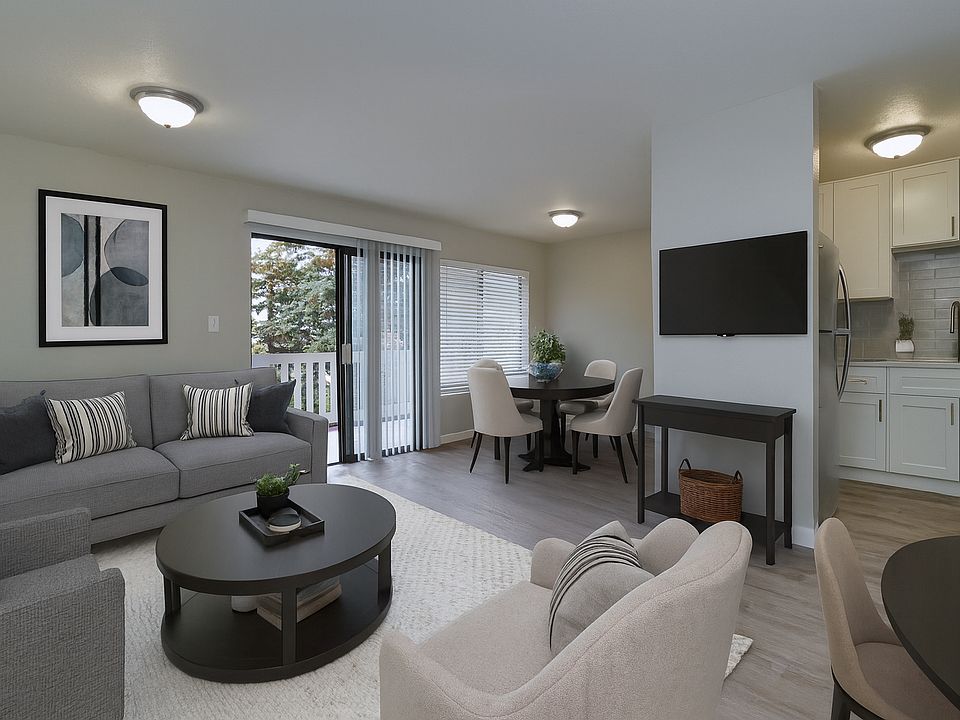 Contemporary kitchenLarge private balconyModern style and comfortSleek finishesHardwood-style flooringQuartz countertopsDesignated dining area