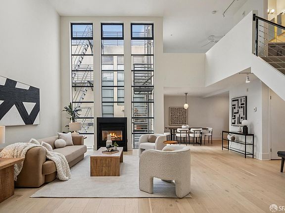 Step inside the top-floor corner residence at 920 Harrison Street, a spacious, light-filled home featuring 1bd/1.5BA, three sides of windows and a dramatic set of skylights. Recently renovated, the main level offers showcases new wide blank oak floors a large living room centered around a fireplace and framed by two stories of windows. An additional lounge area provides a perfect space for a home office. Just off the living and dining areas is a generous kitchen with city skyline outlooks. This level also includes three sizable closets, in-unit laundry, and a convenient powder room. As you ascend to the top floor, you'll be captivated by the enormous walk-in closet, comfortable lounge area, and spacious bedroom, complete with windows on both sides. This home includes deeded parking and additional storage. One flight above the home is roof deck with all incredible skyline views. Perfectly located at 5th Street and Harrison Street. Convenience is key, with easy access to the freeway, Caltrain, the new MUNI Central Subway, shops, restaurants, and entertainment.