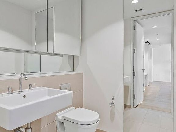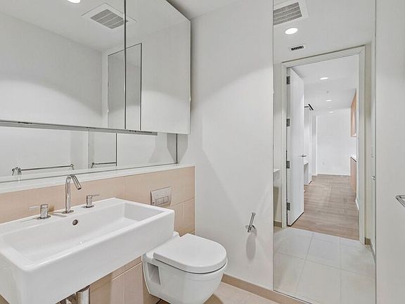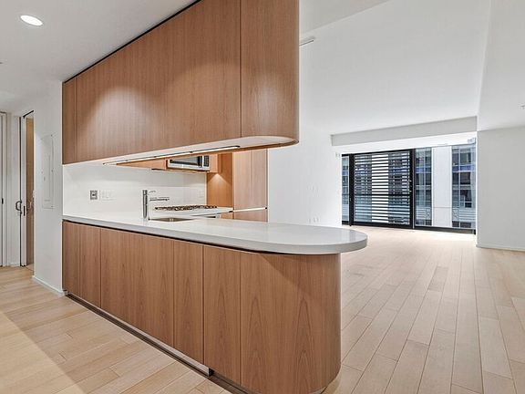 The gourmet kitchen comes complete with high-end white oak Molteni cabinetry with an integrated Thermador refrigerator. Caesarstone countertops and backsplash frame the modern sink fixtures. The L-shaped large countertop creates versatility in the kitchen area, and a stainless steel Bosch electric range and microwave complete the space. The unit's master suite features custom-built-in Molteni wardrobes and an en-suite bath accessed via sliding pocket doors that sports a high-end, deep basin Kohler tub and a gorgeous vanity.