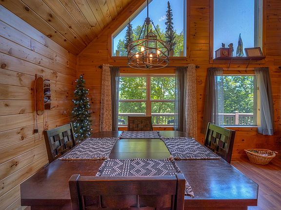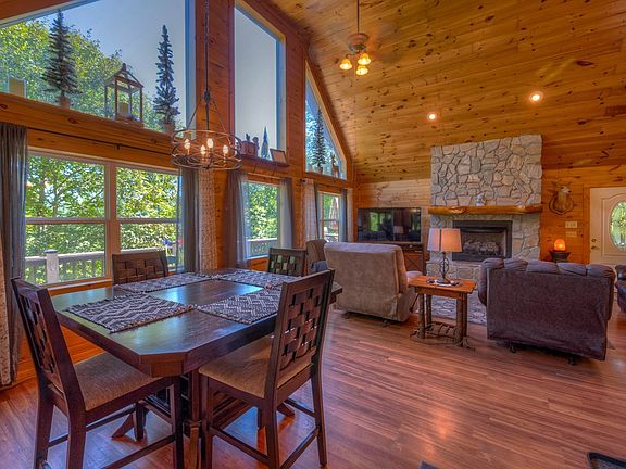 Discover your dream retreat in this stunning chalet-style home nestled in the picturesque Hanging Dog area. Boasting long range views, this open-concept residence features 2 spacious bedrooms and 2 modern baths, perfect for relaxation. When entering the home your greeted by a towering wall of windows looking out into the beautiful mountainous view. Enjoy cozy evenings by the fireplace or host gatherings in the expansive living/dining area. The wrap-around porch and decks invite you to savor the serene surroundings, while the outdoor fire-pit adds to the peaceful, wooded atmosphere. This home offers both privacy and beauty, making it an ideal sanctuary for those seeking tranquility. Very convenient to Murphy, Blue Ridge and Blairsville GA, white water rafting, local vineyards and more! Trout waters nearby! Come see this great home today!