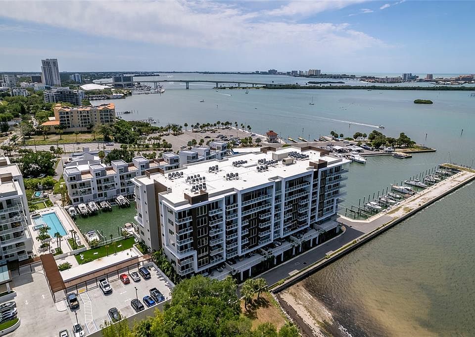 Marina Bay 880 Luxury Waterfront Condo within Clearwater's Premier Pet-Friendly Condominium Community Discover sophisticated coastal living at 920 N Osceola Avenue #403, a fully furnished 2-bedroom, 2-bath plus 10 x 12 den/3rd bedroom in this 2021 luxury waterfront condominium designed by Adache Group Architects. Spectacular Water Views & Designer Living; Enjoy breathtaking south and southwest Intracoastal views from both bedrooms and the living room with sliders to step outside and end your day with spectacular sunsets from your 27 ft long glass-railed balcony. Luxurious Details Await Floor-to-ceiling windows showcase breathtaking water views of the Intracoastal Waterway. Designer finishes include a spacious master suite with a large walk-in closet and an elegant master bath featuring a walk-in shower and double vanity. The open-concept layout, second bedroom, and dedicated office make this space perfect for relaxing or entertaining. Inside, hurricane-impact windows frame your water views while an elegant chef's kitchen featuring Café stainless-steel appliances, quartz countertops, a kitchen island, and soft-close wood cabinetry creates the perfect entertaining space under designer pendant lighting. Resort-Style Waterfront Sanctuary Step into your personal five-star retreat where every moment feels curated for indulgence. Dive into crystal-clear bliss in your Olympic-size, 25-meter saltwater heated lap pool, where stress dissolves with every stroke. Then melt into tranquility at the poolside hot tub and spa, featuring shallow-water sun shelves for luxurious lounging under Florida's golden sunlight. Savor gourmet moments at your outdoor kitchen, fire table and barbecue dining areas where conversations spark and memories ignite under starlit Intracoastal skies. Rejuvenate body and soul in therapeutic saunas and steam rooms that transport you to European wellness retreats, then energize in your state-of-the-art fitness center where personal transformation begins. Challenge friends to billiards in your sophisticated clubhouse with a cozy fireplace, or practice your swing on the putting green where morning coffee meets leisure. Pet Paradise & Marina Living: Marina Bay 880 welcomes up to two beloved furry companions of any size, one of Clearwater's rare large-dog-friendly luxury communities with no weight limit. Watch tails wag in your private, on-site dog run, where friendships bloom. Then, explore scenic Intracoastal walking paths, where sunset strolls become meditative, and morning walks awaken your senses to watercolor skies. Step from your residence to the 69-slip marina with slips available for lease to accommodate yachts up to 80 feet, with convenient lifts for smaller watercraft. Kayaks and paddleboards directly from your waterfront backyard, exploring hidden coves that make Tampa Bay legendary among boating enthusiasts. Prime Location & Effortless Luxury: Perfectly positioned between tranquil Intracoastal waters and vibrant downtown Clearwater, close to Coachman Park concerts, Pinellas Trail adventures, and 15-minute drives to world-famous Clearwater Beach. Both Tampa International and St. Pete airports are within a 30-minute drive. Your comprehensive HOA covers 24-hour concierge service, all utilities, hurricane-grade insurance, and complete maintenance—delivering true lock-and-leave peace of mind with two secure underground parking spaces with EV charging stations available. Book your showing today. See Virtual Tour.