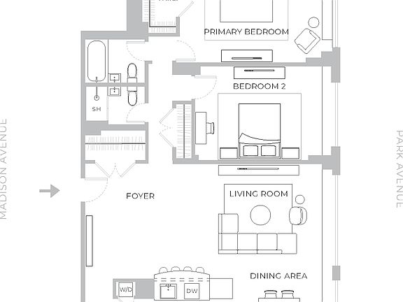 Welcome to this fully renovated two-bedroom, glamorous home at a premier address. This sun filled apartment features an oversized living room with a dining alcove. The gourmet kitchen has top of the line appliances. The primary suite and second bedroom both have generous custom closets. Finally, you have an in home washer/ dryer. This luxurious smart residence allows for sound, lighting, window treatments and temperature controls to be adjusted via an iPad (mounted on the wall) or iPhone App.