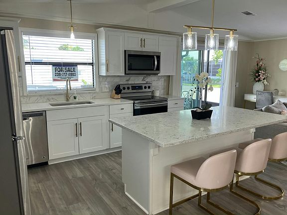Open concept. Bright and airy. Beautifully updated throughout. Granite counters, LVP flooring, newer appliances, A/C newer, and more! Two lanais. Large storage/laundry room with A/C. This home is being sold turn-key. See pics and video to see luxury furniture. All you need to bring is your personal items and toothbrush! Note: there is a golf cart for sale separately. Enjoy your resort-style community with all that Naples has to offer. Dining, shopping, theatres, only 2 miles to the beach, easy access to I-75, clean and well-kept community.