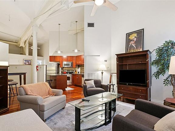 This bright & airy condo has Brazilian Cherry wood floors in the living areas & brand new carpet in the bedroom. 2 large closets; 1 huge walk in closet & 1 reach in. Architectural door & large window overlook the the quiet, tree lined courtyard. Guaranteed parking across Poeyfarre for $175/mo. 24 hour security, onsite management & maintenance, in ground heated pool, huge fitness center and party room. Inside & outside A/C replaced in 2019. Condo Fee includes water & wifi, basic cable, condo insurance, termite/pest contract, management, maintenance & security. Owner has paid 2024 special assessment in full. $150 move in fee payable to Cotton Mill.