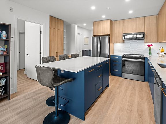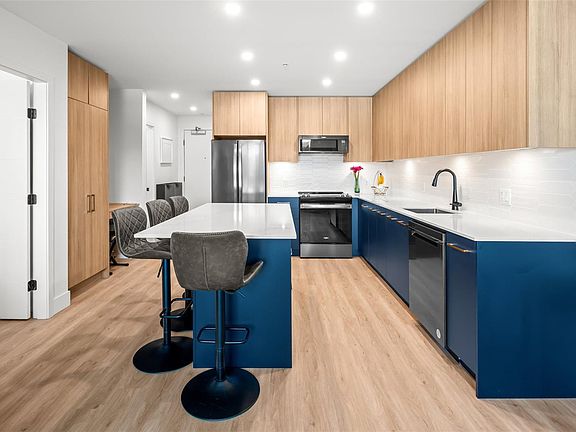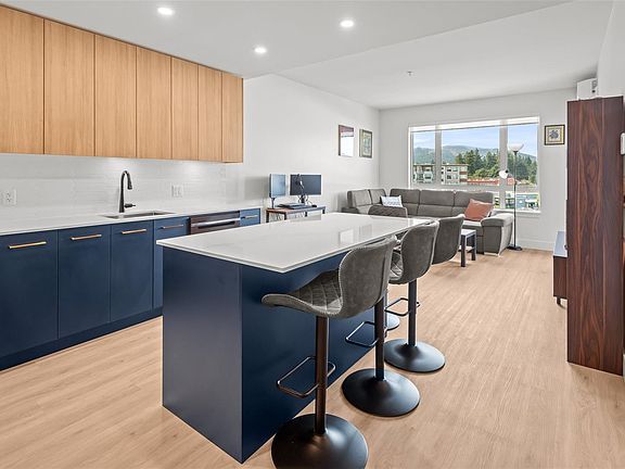 Luxury living inspired by the Pacific Northwest – Welcome to Reunion at Belmont! Experience elevated living in this exquisite top-floor one-bedroom + DEN residence. Soaring 9-ft ceilings, a heat pump, and wide plank flooring set a sophisticated tone. The chef-inspired kitchen boasts quartz countertops, custom cabinetry, generous storage, and premium S/S appliances—there is also extended appliance warranty for added peace of mind. Indulge in the spa-like bath with floor-to-ceiling tile, a deep soaker tub, and designer fixtures. Take in sweeping mountain and treetop views from your sunlit, BBQ-ready patio—perfect for elegant evenings. This pet-friendly building offers secure parking, bike storage, a locker, & resort-style amenities: fitness center, pet club, private terrace, luxurious lounge, & access to the Belmont Club. Just steps to the Galloping Goose trail, fine dining, & transit. Don't miss your chance to live in one of the Westshore’s most desirable communities.