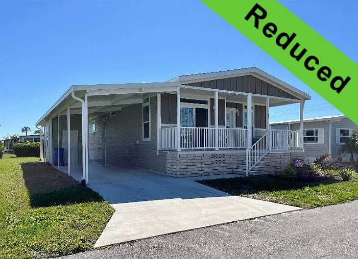 Sit, Rock, and Relax-Your Dream Home Awaits! Welcome to 920 Roseau W. in the highly sought-after Bay Indies Resort Community! This brand-new 2024, 3 bedrooms, 2 bath home offers modern design, new furnishings, and unbeatable value-all still under warranty! Step onto the charming farmer's porch, where you can unwind and take in breathtaking sunsets. With two separate entrances, one leading through a full glass door into the open concept living space and the other via a sliding door from the dining area, this home blends indoor and outdoor living seamlessly. Inside, the spacious living room is designed for comfort, featuring multiple reclining and occasional chairs-perfect for conversation or cozy TV nights. Expansive windows with transom lighting invite natural light to fill the space, complemented by decorative cornices and a stylish tray ceiling, fan and recessed lighting. The dining area comfortably seats six and is positioned conveniently next to the slider, making al fresco dining a breeze. The chef's kitchen is a true highlight, boasting extended island with pendant lighting, waterfall-edge countertops, tile backsplash, stainless steel Whirlpool appliances, and ample cabinetry & pantry storage. This 26' x 56' Class 3-rated home is designed for easy insurance coverage and built to last with sheetrock walls, rounded edges, and high-quality finishes. A separate laundry room provides added convenience, leading to a back patio-perfect for sunbathing, grilling, or simply unwinding. From here, you can access both the covered carport and storage shed. The home features three beautifully appointed bedrooms: bedroom #1 - Versatile space ideal for a guest room, home office, or den, complete with a large closet. Bedroom #2 - Stylishly decorated, featuring a queen bed and roomy closet. Master Suite - A luxurious retreat with a king-sized bed, two dressers, and a walk-in closet. The ensuite bathroom includes: Full-wall dual sink vanity, step-in, double-sized tiled shower, private commode and additional closet space. With everything new, abundant outdoor living areas, and a prime location, this home is an absolute must-see! Call today and make this Florida dream home yours! The 55+ Resort Community of Bay Indies will give you as much or as little to do as you please. Tennis, pickleball, bocce, shuffleboard, kayak launch, 3-mile walking and biking path around the park. There are two clubhouses, numerous clubs, crafts, cards, concerts and dinners to enjoy having a full-time activity director. Venture downtown and you have restaurants on the water, shopping, boating/fishing on the intercoastal, golf and so much more just 2 miles away. Located within close proximity to 3 airports, a casino in Tampa and the Tiger Woods Pop Stroke 2 course putting greens in Sarasota. All listing information given to us is considered appropriate and reliable but should be independently verified through personal inspection by appropriate professionals. Home must be maintained to the Community Prospectus. The lot rent is determined by the Community office and covers all amenities offered including property taxes and lawn maintenance.