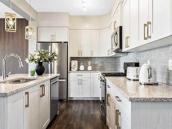 Spacious foyerChef-inspired kitchenWhite shaker-style cabinetryQuartz countertopsGas rangeFridge with water lineOpen-concept layout