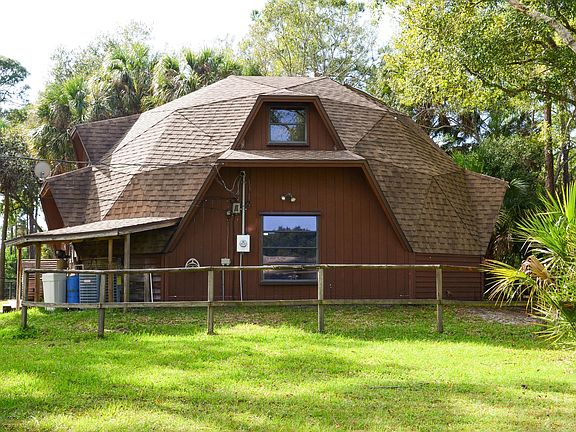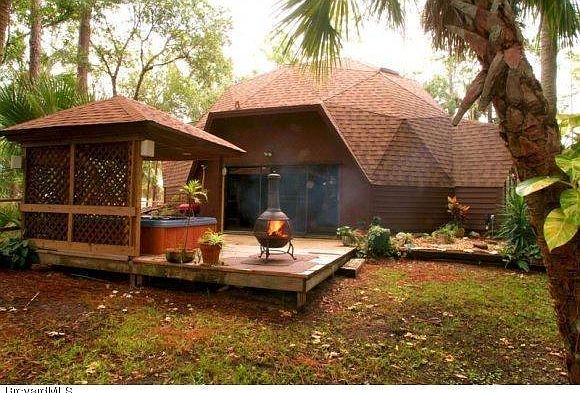This dramatic dome home in Malabar is in favorable Flood Zone X, near conservation lands with horseback riding & hiking trails. Your horse has its own dome shaped stable on a lush lot with a stocked pond & a large spa for entertaining. The geodesic cedar B & B home with Termite Bond & detached 1107sf garage are aerodynamic, considered to be a more energy efficient & stronger design to stand up to hurricane winds than traditional shaped structures. This organic design concept was invented by engineer Buckminster Fuller in the 1940's. The amount of heat a house loses during winter or gains during summer is directly related to the amount of surface area of the walls and roof. A dome-shaped house has the least amount of surface area which contributes to its energy efficiency.