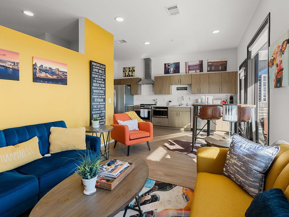 Fully furnished, light and bright and very spacious 1-bedroom condo in the Gulch. Walk to shops, dining, coffee, Broadway, Bridgestone and more! Large king bed in bedroom, plus additional sleeping spaces in living room. Includes in-unit washer-dryer, gym, pool, 1 secured parking spot, lots of street parking. All utilities and WIFI included, available now.