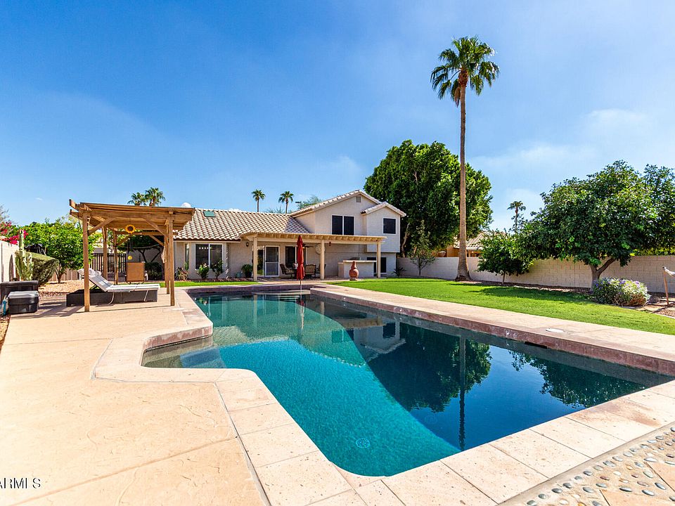 Welcome to Your Dream Home in The Islands, in Gilbert Az! Nestled in the highly sought-after lake community of The Islands, this stunning 5-bedroom, 3-bathroom w/ 3 car garage home sits at the end of a quiet cul-de-sac on a1/4acre lot, an entertainer's dream! Step into your private oasis featuring diving/lap Pebble-Tec pool, stamped concrete, 22 X 10 custom pergola, Built in BBQ & lush grassy yard with plenty of room to play and relax! Inside, this beautifully updated San Clemente model by Blandford Homes offers a perfect balance of style and function featuring 3 bedrooms & 2 bathrooms upstairs, 2 bedrooms, 1 bath + spacious bonus room downstairs and family room, dining room and eat-in kitchen on the main floor. Updated kitchen with granite countertops, stainless steel... appliances. New carpet, tile flooring & exterior/interior paint. Major upgrades include new roof & HVAC in 2022, complete in-home water filtration system 2018 and new pool pump with tile surround. The Islands community offers resort style amenities including 74 acres of lakes & 30 acres of grassy park space, basketball & sand volleyball courts, bocce ball, playgrounds, ramadas, walking paths, community dock, & special events! All this just-minutes, from Downtown Gilbert, Gilbert Regional Park, and the Santan Village Mall. Don't miss your chance to live in one of Gilbert's most vibrant lake communities!