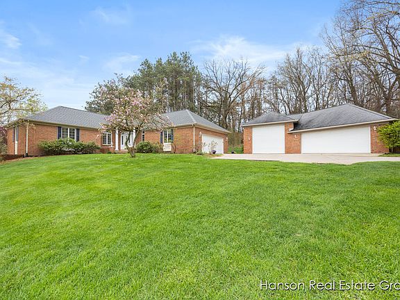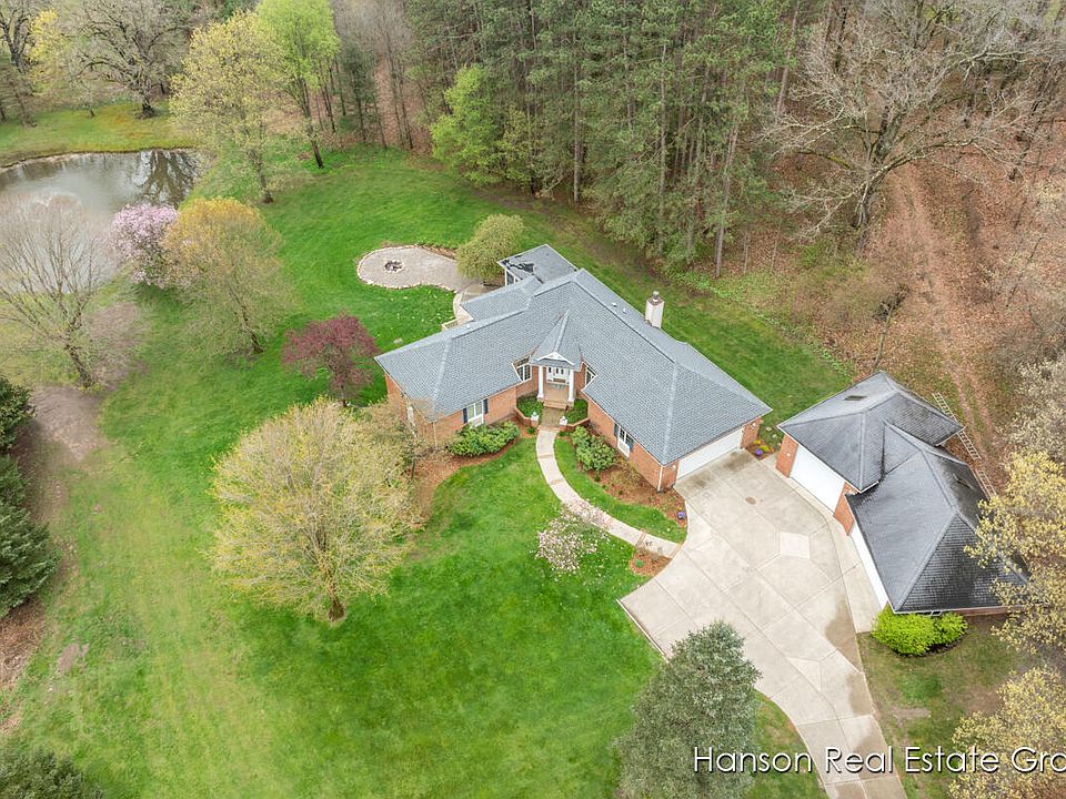 Absolutely stunning One Owner 11 acre wooded Sanctuary in Forest Hills School district just minutes away from downtown Ada. This well maintained brick walkout ranch boasts three bedrooms (& office/ 4th bedroom), two and ½ bathrooms. The main level includes a fully equipped kitchen with dining area, a spacious great room with trayed ceilings, main floor laundry room, a sunroom offering picturesque views of pond & property, and a master bedroom with an ensuite bathroom. 9'' ceilings throughout, Newer Geothermal heat (2019), New Roof in 2023 The 28x50 oversized all brick 3 stall accessory building barn offers tons of space for new ideas, projects, and storage. Don't let this opportunity pass you by, schedule your private showing today! Seller reserves the right to call for highest and best. Property cannot be split.