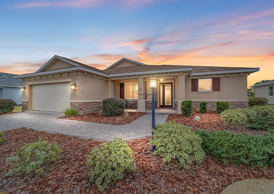 This stunning FORMER MODEL home in the Alendel neighborhood offers breathtaking views of the 4th fairway. This Livingston has 2 bedrooms, 2 bathrooms, flex room and a 2.5 car garage. The spacious flex room includes electric blinds, making it a perfect office or den, while the living room boasts a tray ceiling, a ceiling fan, and a shade over the sliding glass doors leading to the screened lanai. The gourmet kitchen is designed with a large quartz island, staggered cream cabinetry, a tile backsplash, stainless steel appliances, and a walk-in pantry. The primary suite offers a tray ceiling, a ceiling fan, blinds, a window overlooking the lanai, and a generous walk-in closet. Its ensuite bath features a double vanity with quartz countertops, a large tiled shower with a glass enclosure, and a linen closet. The 2nd bedroom includes blinds and a closet, while the 2nd bath is complete with a quartz vanity and a tub-shower combination with tile. The screened lanai is perfect for relaxation, featuring 2 ceiling fans, a triple slider, and stunning golf course views. The laundry room is well-equipped with cabinets, a quartz countertop, and a utility sink. The 2.5-car garage is ideal for a workshop, offering epoxy floors and an impressive 32 lights for excellent visibility. Located in Ocala's premier, gated, active 55+ community, loaded with amenities, including golf cart access to 2 shopping centers.