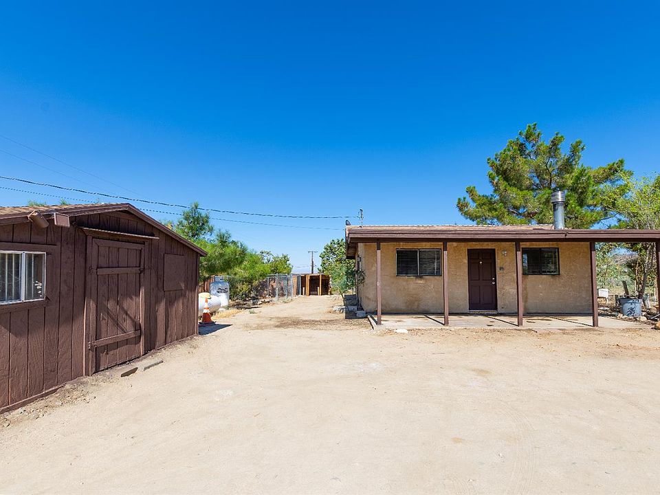 Pretty and cozy cabin on 2.5 acres partially fenced in great condition in beautiful Pinon Hills! Seclusion with a view of the mountains from the large front covered patio and of the desert from the rear (you can see all the lights at night!). Indoor laundry hookups. New oven. TONS of built-in cabinetry to store lots of things. 2 storage sheds. Fenced dog run. Wood burning stove with built-in fan. Live in this nice rural area in park like surroundings with views!