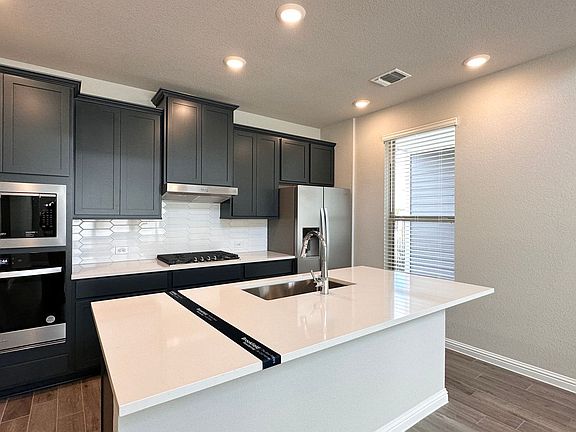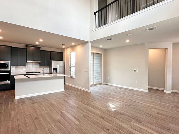 Welcome to this stunning contemporary home featuring high ceilings, an open-concept layout, and stylish finishes throughout. The spacious living area is filled with natural light from tall windows, creating a warm and inviting atmosphere. The gourmet kitchen includes sleek dark cabinetry, quartz countertops, stainless steel appliances, and a large island perfect for entertaining or casual dining.