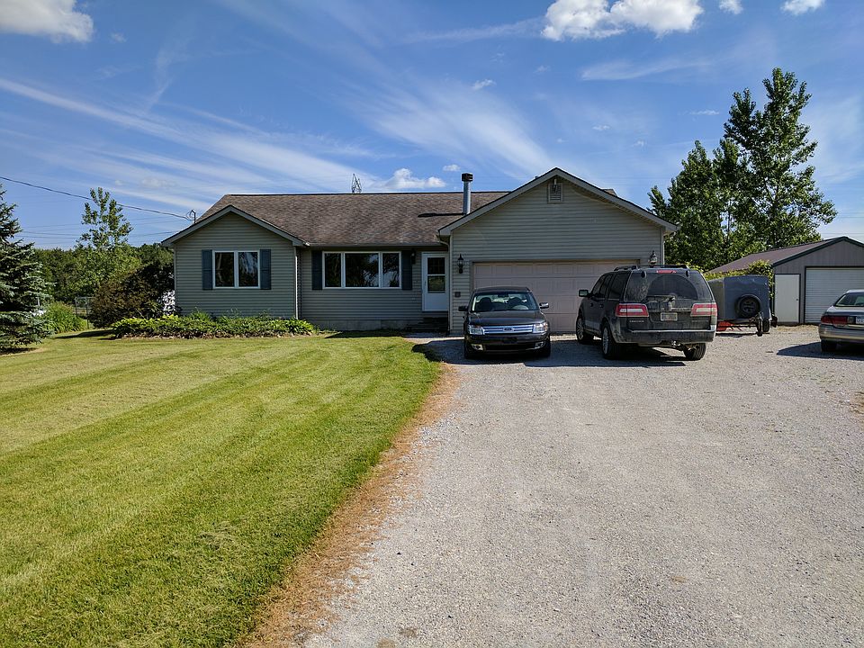 3 Bedroom vinyl sided ranch. 2.39 acres with many trees, property backs to farm fields and woods. Poured basement with high ceilings. 2 car attached garage. Large newer composite deck off of kitchen. Above ground pool. Steel out building with 2 roll up doors and an entry door, cement floor. New carpet and fresh paint throughout. Master bedroom is very large 14x14 with master bath and large WIC. 2nd bedroom also has large WIC. 2 full baths both have linen closets. First floor laundry. Large eat in kitchen with island, large pantry and newer stainless appliances. Great room has stone wall with fireplace and vaulted ceilings. Andersen casement windows and solid wood doors throughout. Roof was replaced with tear off(unsure of the year). Central air. Immediate occupancy. 810 357-8942.