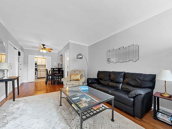 The separate kitchen is thoughtfully designed with abundant cabinetry and cooking space. The bathroom is a standout, featuring a sleek stall shower, a Toto toilet, stylish tiles, and pedestal sink. An additional alcove provides valuable extra storage, complementing the apartment’s two generous closets. Rich hardwood floors complete the home as well as low monthly maintenance of only $585.
