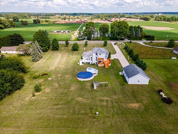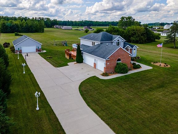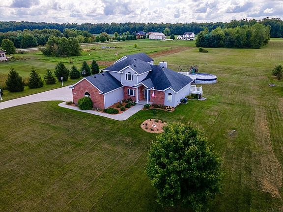 A serene country setting on 3.5 acres with easy access to I-69, Fort Wayne, Churubusco, Columbia City and Northwest Allen County Schools. Quality upgrades that stand out. 2x6 construction, 200 amp service, Pella slim shades, rounded corners, oak six panel doors, extra wide oak decorative trim throughout, three decks, lighted 6 inch thick concrete driveway, low maintenance landscaping, 40x30 finished outbuilding with 2 overhead doors, is piped for compressed air, a 220 outlet, a propane heater, a floored attic with walk up access, and 100 amp service, and a 27 foot diameter above ground pool (liner and pump only two years old). Welcome family and friends in the foyer entry that features a decorative arched window, oak hardwood floors, leaded glass door, and an open staircase. A formal dining room for special occasions that has a double trey lighted ceiling, crown molding, oak hardwood floor & chair railing. The two story great room has a cathedral ceiling, trapezoid windows, wood burning fireplace with gas lighter, oak mantle and a lighted cubicle. The centerpiece of the home, the light and bright kitchen offers custom cabinets, stainless appliances, newer LG refrigerator, great prep island/breakfast bar, built-in pantry, ceramic tile, and the eat-in area overlooks french doors with easy access to the deck and propane hook up for the grill master. The ever convenient 1x6 combination laundry/mudroom is steps away. . Retreat to the owner's suite with a vaulted barrel ceiling, french doors to a private deck, a luxurious bath with jetted tub, separate shower/commode room, dbl vanity and a large walk in closet. The three bedrooms upstairs all have custom ceilings, ample closet space, and the full bath has a separate commode/shower area. The daylight lower level is a wonderful place to entertain or watch the game at the awesome wet bar w/refrigerator, a cozy brick gas fireplace and a decorative ceiling over the pool table area. The 5th bedroom with a full bath is the perfect spot for guests. The 1000 gallon propane tank is owned and recently filled. The flag pole, basketball goal and swing set all remain.