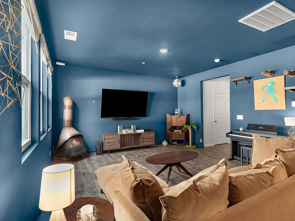 The kitchen boasts granite countertops, a spacious island with seating, stainless steel appliances, and modern white cabinetry framed by eye-catching designer details. Whether hosting a dinner party or enjoying a quiet night in, the ambiance is effortlessly chic.