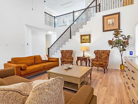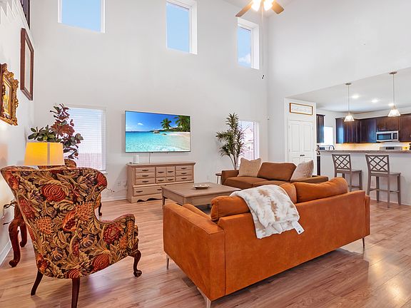 INDOOR: Two living rooms with comfy decor, smart TVs, breakfast bar, bar stools, vaulted ceiling, ceiling fans, office converted to 4th bedroom, dining table, laundry room, air conditioned garage