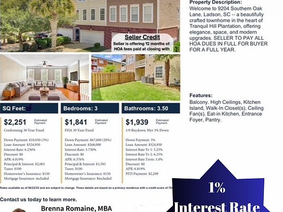 SELLER TO PAY HOA DUES IN FULL ON BEHALF OF THE BUYER FOR A FULL YEAR WITH AN ACCEPTABLE OFFER. PLEASE SEE FLYERS FOR ADDITIONAL INCENTIVE INFORMATION.Welcome to 9204 Southern Oak Lane, Ladson, SC -- a beautifully crafted townhome in the heart of Tranquil Hill Plantation, offering elegance, space, and modern upgrades. Property Features include gleaming hardwood floors, grand ceilings, wainscoting throughout, sun-filled interiors with ample windows and crown molding. Chef's kitchen with 42'' maple cabinets, custom pantry shelving, and top-tier appliances Owner's suite with walk-in closet, garden tub, and separate shower. Bonus room on the first floor with its own full bath and private, patio access. Recent Upgrades include a new roof installed this year,added electrical outlets, GFI's, switches, and smoke detectors. Enhanced living room wiring for wall-mounted, TV, custom pantry shelving for double the storage, two-car garage, balconies off kitchen and master bedroom, fenced yard with irrigation system. new Trane HVAC unit installed May 2025 with a transferable warranty. HOA includes lawn care, power washing, and exterior maintenance. Access to clubhouse, pool, and dog park. Located in the desirable Dorchester District 2 school zone, this turnkey townhome blends luxury with low-maintenance living. Whether you're hosting guests or enjoying a quiet evening, 9204 Southern Oak Lane is ready to impress!