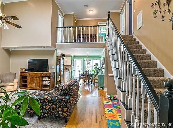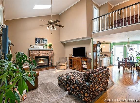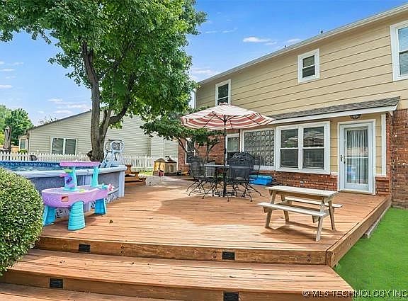 3 or 4 bedroom, 2 full baths, 2 car garage, woodburning fireplace with gas, new roof in 2024, tankless water heater, 2 x 6 exterior walls, post tension slab, corner lot with trees, fresh exterior paint, above ground pool, extensive decking, 16 x 8 storage shed, completely updated kitchen with new cabinetry, fixtures and granite, master on first level, 2 large bedrooms, a full bath plus bonus room (could be 4th bedroom) on second level, Jenks School District.