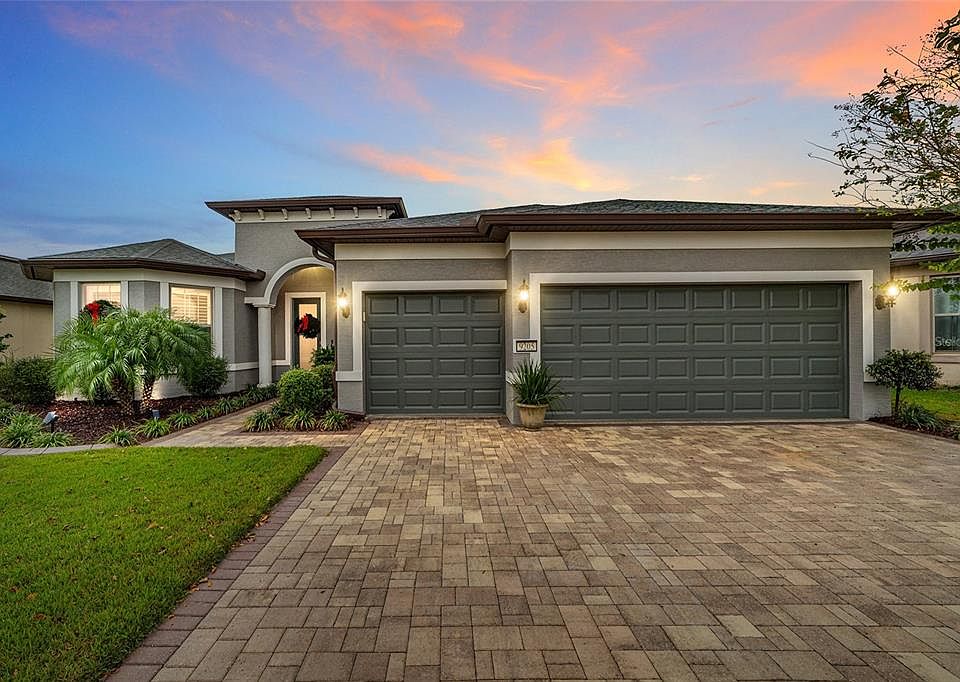 This one will not last long! Pride of ownership shows throughout this gorgeous Pinnacle model located in the gated Stone Creek Golf Course Community. Stacked with curb appeal with upgraded landscaping, paver lined driveway, and decorative concrete curbing this beautiful home will not disappoint. All the highly desired features and upgrades can be found in this spacious home with a bonus den/office area and an upgraded stretched garage offering extra space for a golf cart and workshop area. The versatile and open floor plan features a welcoming foyer with a glass inset door opening to a light and bright, neutral color palette with diagonally laid, 20x20 porcelain tile floors, high ceilings, recessed lighting, and 8' doors throughout. Top of the line Chef's kitchen with an oversized island for casual dining and meal prep, stainless appliances, quartz countertops, a walk-in pantry, and 42" staggered height custom cabinetry. The kitchen is open to the dining/living area with triple sliders to a screened Florida room overlooking tree-lined green space and providing desirable flex space perfect for entertaining with family and friends. The main suite offers a spacious walk-in closet and en suite bath with his/her sinks, a large walk-in shower, a luxurious soaking tub, and a transom window for natural lighting. Plantation shutters, an inside laundry room with plenty of cabinetry for extra storage space, and upgrades around every corner make this a home that you will not want to miss. Move in and enjoy fantastic community activities and amenities including a golf course, resort-style pools, health spa, trips and entertainment, and more!