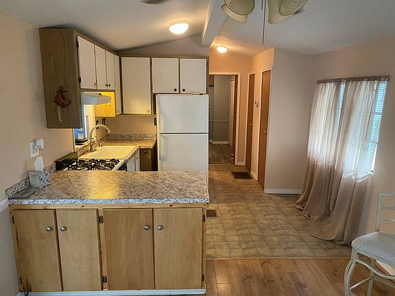 Welcome to 7 Oaks R.V. Resort 50 plus community only $390.00 Lot Rent Hudson, Fl 34667 Great location just off Little Rd 2 Bedroom 1 Bath Drywall finished walls, Newer wonderful vinyl and laminate wood floors throughout, Huge living room with lots of windows, Kitchen with snack bar and lots of counter and cabinets space with pantry cabinet, Bathroom with tub / shower combined w/ linen cabinet in hallway, Large Primary bedroom room has space for King size furniture and back door, Guest bedroom space for Queen size bed great for dressing room w/ drawers and closet space, or office . Large corner back lot with lots of space between neighbor, Large 10+34 Patio Shed Central air 2016 Dog Park accross the street Extra parking space