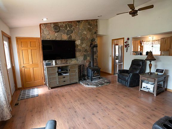 4BR/2BA home on 4+ acres with two large detached garages. Hickory cabinets in the kitchen along with stainless steel appliances bring a polished contemporary look to the room. Living room has a spacious feel with the vaulted ceiling and a stunning stone accent wall and a bay window. There is a large deck off the living room which extends your living space to the outdoors for dining or entertaining. Part of the exterior of the home is accented with brick for great curb appeal. A large, detached garage with a workshop in the back for all your special projects and hobbies. The second garage is storage for all your toys. The 4-acre lot is wooded on both sides for privacy. Located close to Bemidji for all your shopping, restaurants, parks and other needs.