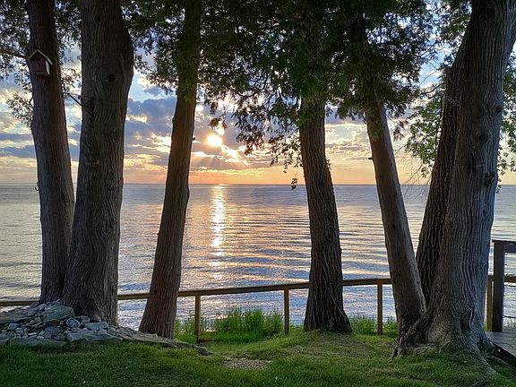 Best view on the bay with amazing sunsets! Move right in...furnishings included. Charming & Cozy 2 bedrm, 1 bath seasonal cottage/condo on the Bay! open concept w/ cathedral/cedar ceiling w/ skylight, oak/mission style cabinetry, tumble stone backsplash, snack bar, Ceramic Tile floor. Bedrms w/ HW floors, updated full bath w/raised ceiling, shower/tub surround. Patio drs to enclosed porch w/ knotty pine ceiling & entry to deck overlooking Bay/rock shoreline. Community inground pool, basketball courts, green space. Stunning views/sunsets w/ firepit. Black top parking. .445' shorefront on 8.3 acres. Summer condo/cottage-water lines to shared well not deep enough for winter use, per seller.