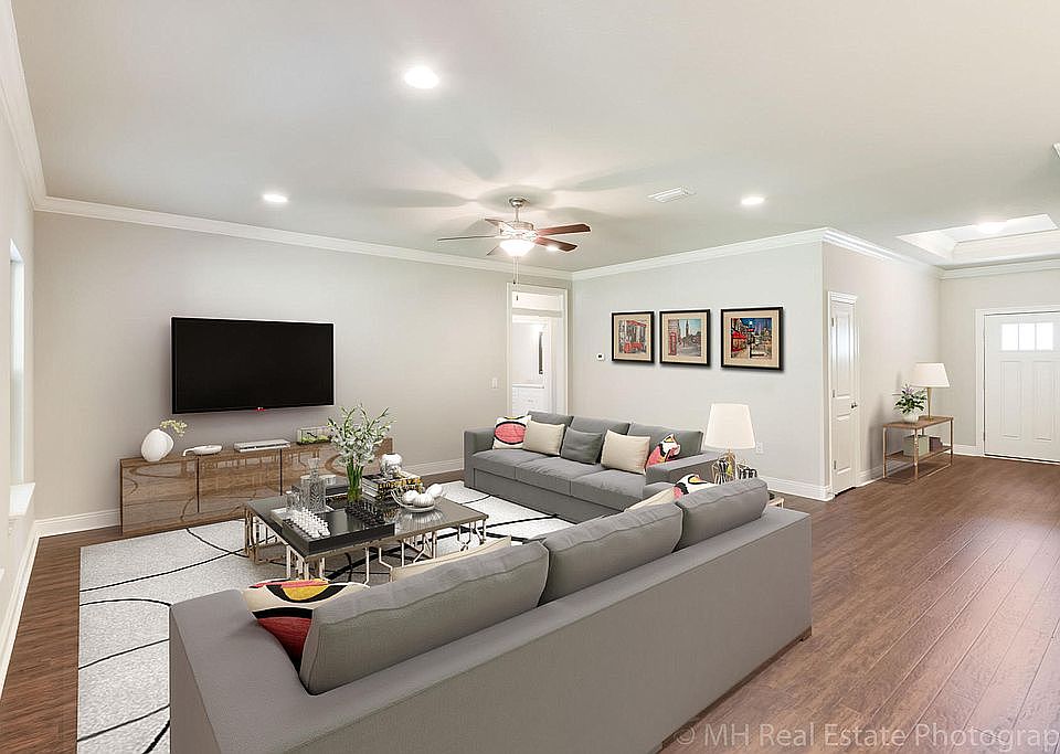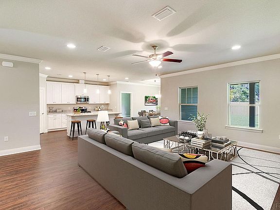RAMSEY & WALKER home. Exceptional new home located in a prime east Navarre location with many upgrades throughout. Clad with the timeless durability of brick, cement fiber board accents, and an architectural shingled roof. Sprinkler system and fenced backyard comes standard! Interior offers thick wood laminate flooring in the common areas, visually pleasing neutral tile in the baths and laundry room, and carpet in the bedrooms. Custom paint color is accented with a wide baseboard, beautiful crown molding, and spectacular tray ceiling accents in the master bedroom, dining and entry area. Transom windows over the hall entryways provide a high end custom touch. Stainless steel appliances including refrigerator, stunning shaker style cabinets, and granite throughout finish the home exquisitely.