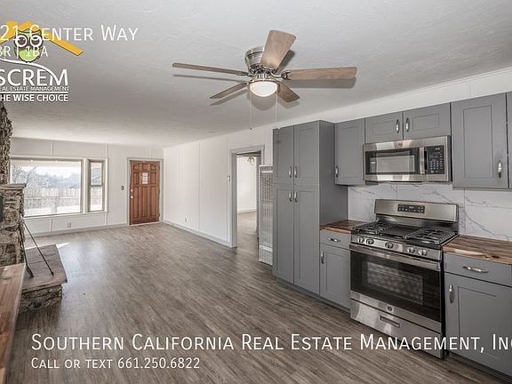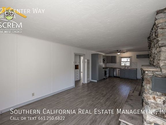 Charming two-bedroom home with an option for a third bedroom and one bathroom located in Frazier Park. The property features a gated entrance that leads to this cozy residence. A spacious front porch welcomes you into the bright living room, which boasts luxury vinyl plank flooring and a brick fireplace. Adjacent to the living room is the open kitchen, equipped with stainless steel appliances, beautiful countertops, soft-close drawers, a ceiling fan, and a custom table. The kitchen appliances include a gas stovetop, a single oven, a dishwasher, and a microwave. There is a generous bonus room that can serve as either an additional living room or a third bedroom. This versatile space includes luxury vinyl plank flooring, a stone fireplace, a built-in closet, washer and dryer hookups for a stackable unit, a custom folding table, and a separate entrance with French doors leading to the front porch. Both bedrooms feature ceiling fans, luxury vinyl flooring, and built-in closets. The full bathroom completes the layout. There is ample parking available within the gated entrance. This home is conveniently located within walking distance to trails, restaurants, and shopping. *Owner may consider a pet.