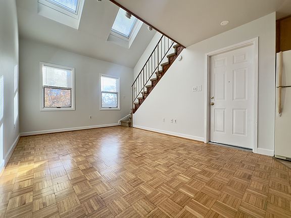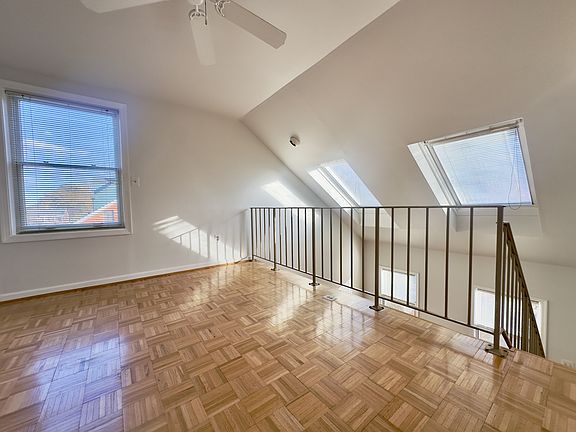 The apartment features natural oak hardwood flooring throughout and newly installed central air conditioning and heating. It is an unusual unit, offering excellent natural light from windows facing north, south, and east, complemented by several skylights.