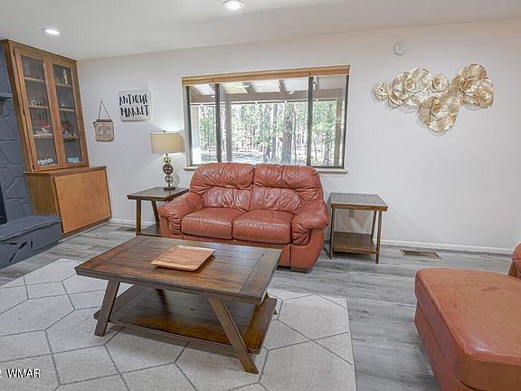 Stunning 2444sq ft home on .78acres in the tall pines of Pinetop, AZ! This well-built home has separate family room with wood burning fireplace, living room with pellet stove. Open concept kitchen has all new state of the art appliances. Wood burning stove off kitchen to heat laundry room and office off kitchen. Primary bedroom has in suite bathroom with custom tiled oversized walk-in shower, and custom closet. Double french doors off kitchen open to the private back deck in the fully fenced yard. Back yard has a separate building with electric, potential guest house, she shed, man cave or? New flooring throughout the home. Great family home or STR. NO HOA! Close to everything in Pinetop AZ walk to restaurants and entertainment. One hour from Sunrise Ski Resort. Near golf and fishing.