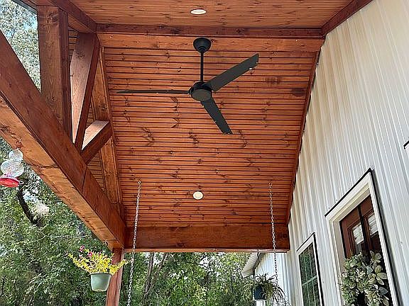 Tankless water heaterOpen floor planWalnut stained wooden detailsLarge kitchen islandCustom built metal houseCustom cabinetsVaulted ceiling