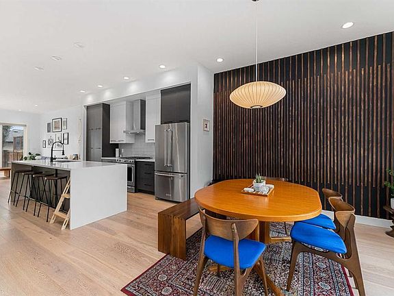 Engineered hardwood flooringOpen bright layoutFormal dining areaSleek gas fireplaceOversized sliding glass doorsChef-inspired kitchenStainless steel appliances