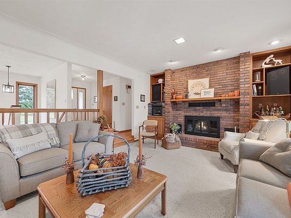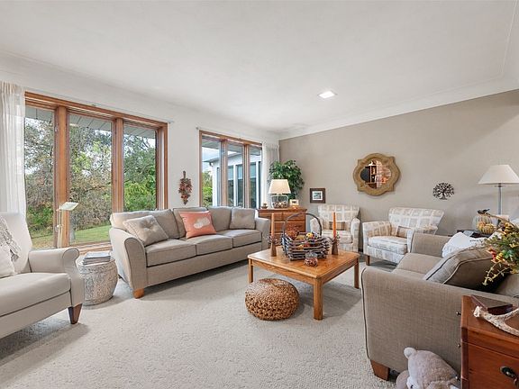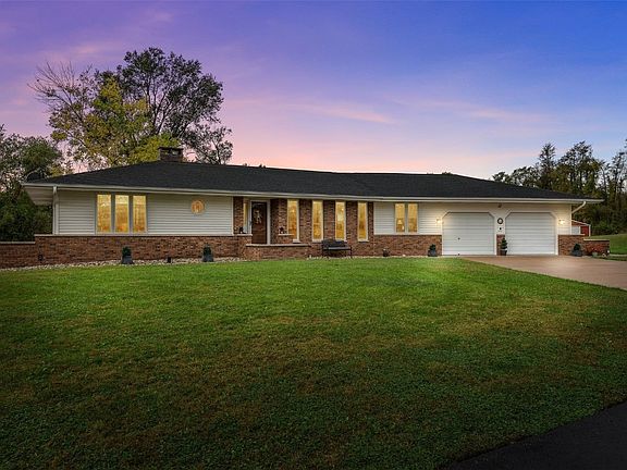 This is the acreage you have been looking for! Conveniently located, rare in town acreage ( 4.57 acres), with 2 outbuildings. Pole building number 1 is 42 x 84 and boasts a shop area that is heated and has window air and a cement floor area that is 24 x 42. The second building, a pole barn, is 33 x 96. Quality built 3 bedroom, 2.5 bath ranch home with walkout basement. First floor includes a large living room with a gas fireplace flanked by built-ins, a formal dining room, and an office which could be used as an additional bedroom. 2 good size bedrooms, main floor bath, large eat in kitchen and an additional one half bath. Off the kitchen is a wonderful 320 sq ft 4 seasons room built in 2021 overlooking all the beauty of trees in your private back yard. Oh wait there's more: the lower level which could be used as a mother in laws quarters features a large family room with sliders to a patio, another kitchen area with lots of cabinets and room for a dining table. A huge additional bedroom, another full bath, laundry room with storage, and an exercise room with a sauna that stays. There is plenty of additional storage. 2 car oversized attached garage with a maintenance free TSR Polyaspartic floor coating with a center drain perfect for easy cleaning. Enjoy low county taxes with the convenience of being close to in town amenities.