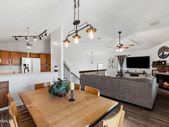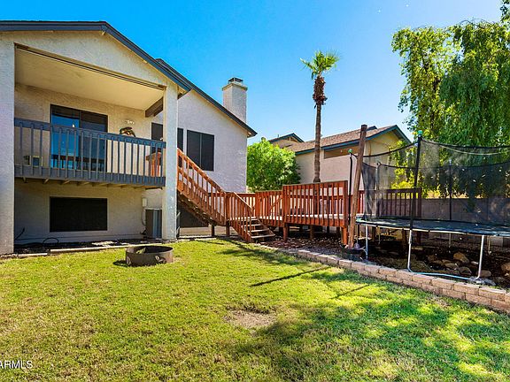 Welcome to Stonebridge Gardens - Where Comfort Meets Charm! Step into this beautifully updated home that radiates warmth and versatility! Located in the sought-after Stonebridge Gardens community, this spacious residence offers 3 bedrooms and 2 baths, thoughtfully designed for both privacy and togetherness. Upstairs, you'll find two cozy bedrooms and a full bath just off the inviting great room with a fireplace—perfect for relaxing or entertaining. Downstairs, the expansive master suite is a true retreat, complete with updated bathroom, a bonus room ideal for a home office, hobby nook, or even a dream walk-in closet. This flexible layout makes it a fantastic option for multi-generational living! The home is packed with thoughtful upgrades: New hot water heater in 2024, freshly painted, custom wooden blinds, updated wood-look tile floors throughout, ceiling fans, trac lighting, new front door and garage door, and new cabinet hardware. What truly sets this home apart? It's the large private yard, complete with trampoline and a giant show-stopping deck that's perfect for weekend BBQs, family gatherings, or simply soaking up the sun. The garage offers a dedicated workspace and ample storage, making it as functional as it is spacious. The community also offers multiple park areas, a pool, full-size basketball court and a playground for the kids. Conveniently located near the I-60 Freeway, 2 airports, shopping, top-rated schools, parks, and dining.