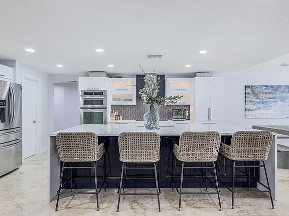 This newly updated home on an oversized water direct-gulf access estate lot boasts six bedrooms, three bathrooms, and a spacious den with an open concept living area. The well-equipped designer kitchen features Cambria quartz countertops, a center island with a waterfall edge, contemporary white and navy blue cabinets, custom lighting, and stainless steel appliances. The primary suite, designed to resemble a spa, includes dual sinks with a makeup vanity, a standalone tub and shower, and ample space for relaxation. The lanai area offers a separate pool and spa, equipped with a new dual pool pump, heater, and Aqualink system. Additionally, the estate features a new upgraded metal roof, new extra high seawall, new oversized 14,000 lbs boat lift capable of accommodating a 40 ft boat, a new hot water heater, new upgraded air-conditioning systems and ductwork, a new screen enclosure, attic insulation, impact windows, entry door, and impact garage door. Notably, the home is being sold furnished, providing potential buyers with a hassle-free move-in experience.