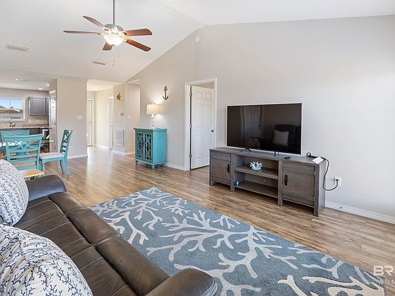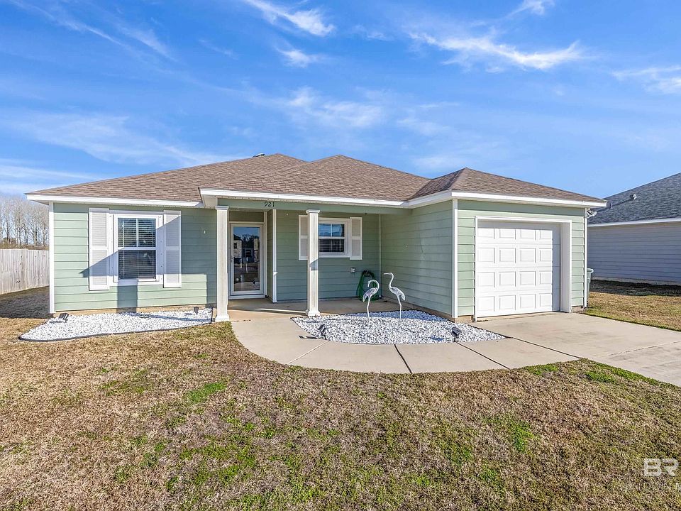 Beautiful coastal cottage in McSwain Subdivision, Foley. This charming home boasts a split-floor plan with three bedrooms and two baths featuring a spacious main living area with vaulted ceilings. The kitchen is equipped with granite countertops and stainless-steel appliances, (refrigerator, washer, and dryer included). Both bathrooms showcase elegant granite countertops, while the master bath includes a relaxing garden tub. Located in a quiet cul-de-sac. This property offers convenience to shopping, schools, restaurants, medical care facilities, and is only minutes away from the beach. Enjoy the serene coastal lifestyle in this well-maintained home. Furnishings are negotiable. Built Gold Fortified