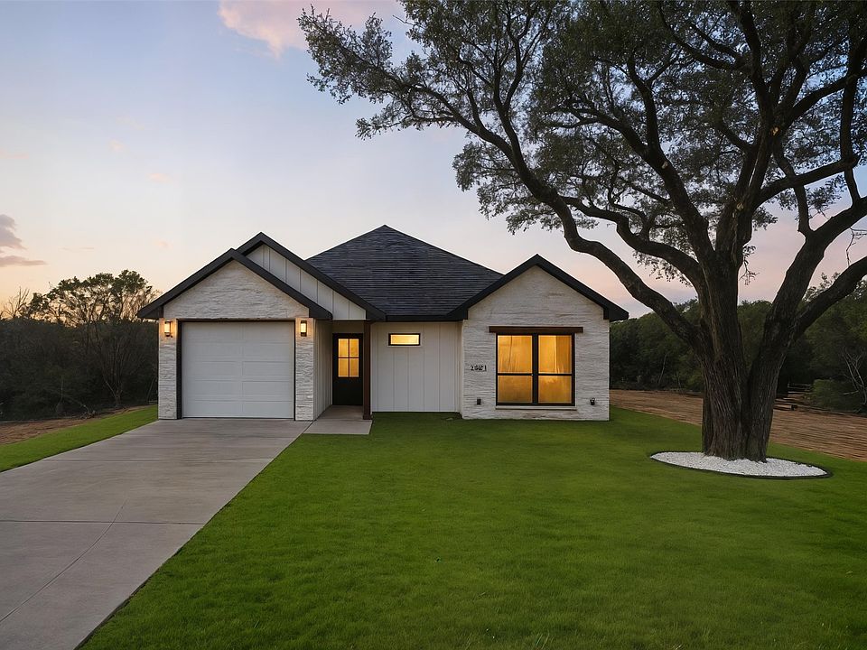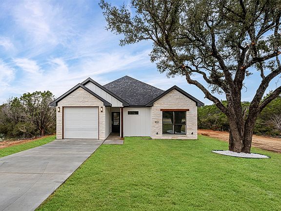 Brand new 2025 home and EVERYTHING IS INCLUDED WITH THIS BUILDER! This local Granbury builder is known for his beautiful, fully loaded, yet affordable new homes! Welcome home to 921 Thicket Trail located in the heart of Granbury in Comanche Cove! 3 full bedrooms, 2 full baths, living room, breakfast area, large open kitchen, and separate utility room. A very roomy and comfortable 1441 square feet of open space! Inside this home you will be amazed! Elegant entry features open space and a built in desk and cabinets perfect for the office or homework! Living room features wood look tile flooring, ceiling fan, electric fireplace, built in cabinets, and energy efficient double pane windows with great views. Step into the loaded kitchen and let's cook dinner! Beautiful quartz countertops, tons of beautiful white cabinets, walk in pantry, and a sizable kitchen island. Kitchen comes complete with full stainless electric appliances! Refrigerator, cook top stove, built in microwave, and dishwasher. Breakfast area is located just off the kitchen for all the family meals. Large and very functional utility room with full size washer and dryer connections. Also in the utility room is a convenient mud area where you can sit and take off your shoes, store the kids backpacks, and hang your winter coats. Master bedroom is large and open featuring wood look tile flooring, ample windows, and ceiling fan. Master bath is a dream bath! Oversize walk in shower, double sinks, walk in closet, quartz countertops. Secondary bedrooms are very roomy with walk in closets and ceiling fans Second bath features quartz countertops and a large walk in shower! What else is included you ask? 2 inch white wood faux blinds on all windows, gutters on the outside, wood privacy fence, sod, landscaping, covered front porch and covered back patio, a full 1-2-10 home warranty, 1 car oversize garage with opener, and all located on a very nice oversized lot. Also check out the beautiful mature Oak tree out front!
