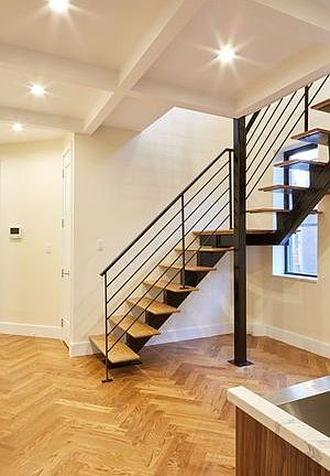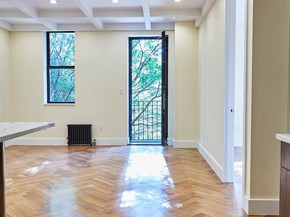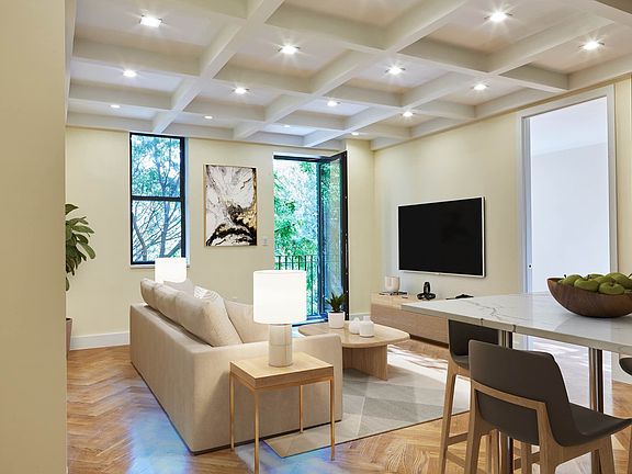 This incredible 5 bed 3.5 bath Rent Stabilized unit is beautifully crafted, featuring herringbone white oak chevron hardwood floors, lofty high coffered ceilings and recessed LED lighting.
