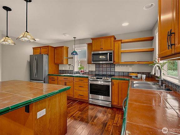 Mature landscapingOpen to the kitchenXl fully covered deckDouble bay garageCustom design and finishesPlentiful counter spaceTwo separate sink areas